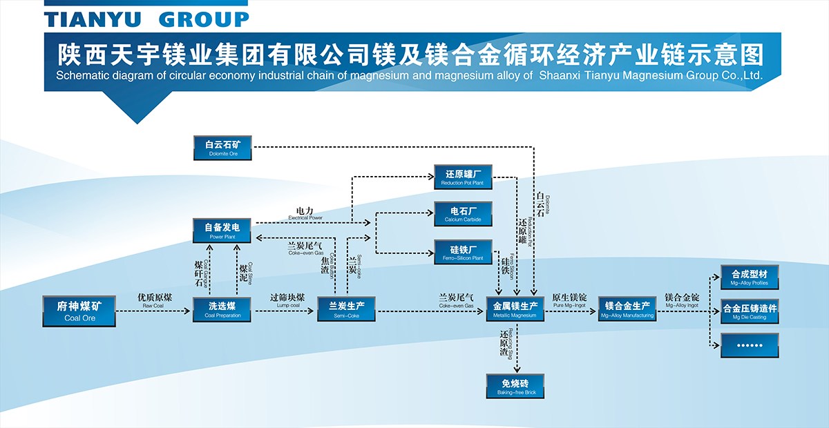 陜西天宇鎂業集團有限公司是一家以蘭炭生產為基礎產業,鎂及鎂合金生產為主導產業,并涉足冶金化工、物流開發、電子商務、酒店經營等行業的資源綜合利用型循環經濟企業集團。旗下有七家獨資公司、六家合資公司,年總營業收入超過20億元。
